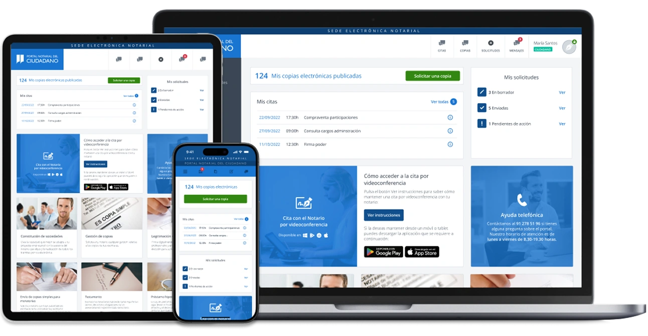 El Portal Notarial del Ciudadano permite gestionar trámites notariales desde cualquier dispositivo, con acceso seguro a la documentación, contacto directo con notarías y la posibilidad de realizar determinados actos jurídicos en línea.